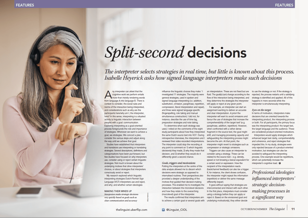 In the article I talk about (signed language) interpreting as a goal-oriented process, presenting the most important findings of my PhD research (KU Leuven, Belgium) and insights from my follow-up postdoctoral study (University of Warwick, UK).